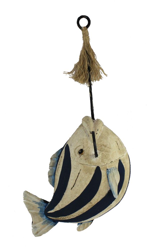 This 11.5”H Wood Hanging Fish with Hook Figurine would make a great addition to any room in your home. This item is made of wood and measures approx. 11.5”H x 5.5”L x 2.5”W. Gorgeous distressed painted finish. Hangs easily using the provided rope at the top! Place this item in your bar, beach house, or in any other nautical themed room you can imagine.