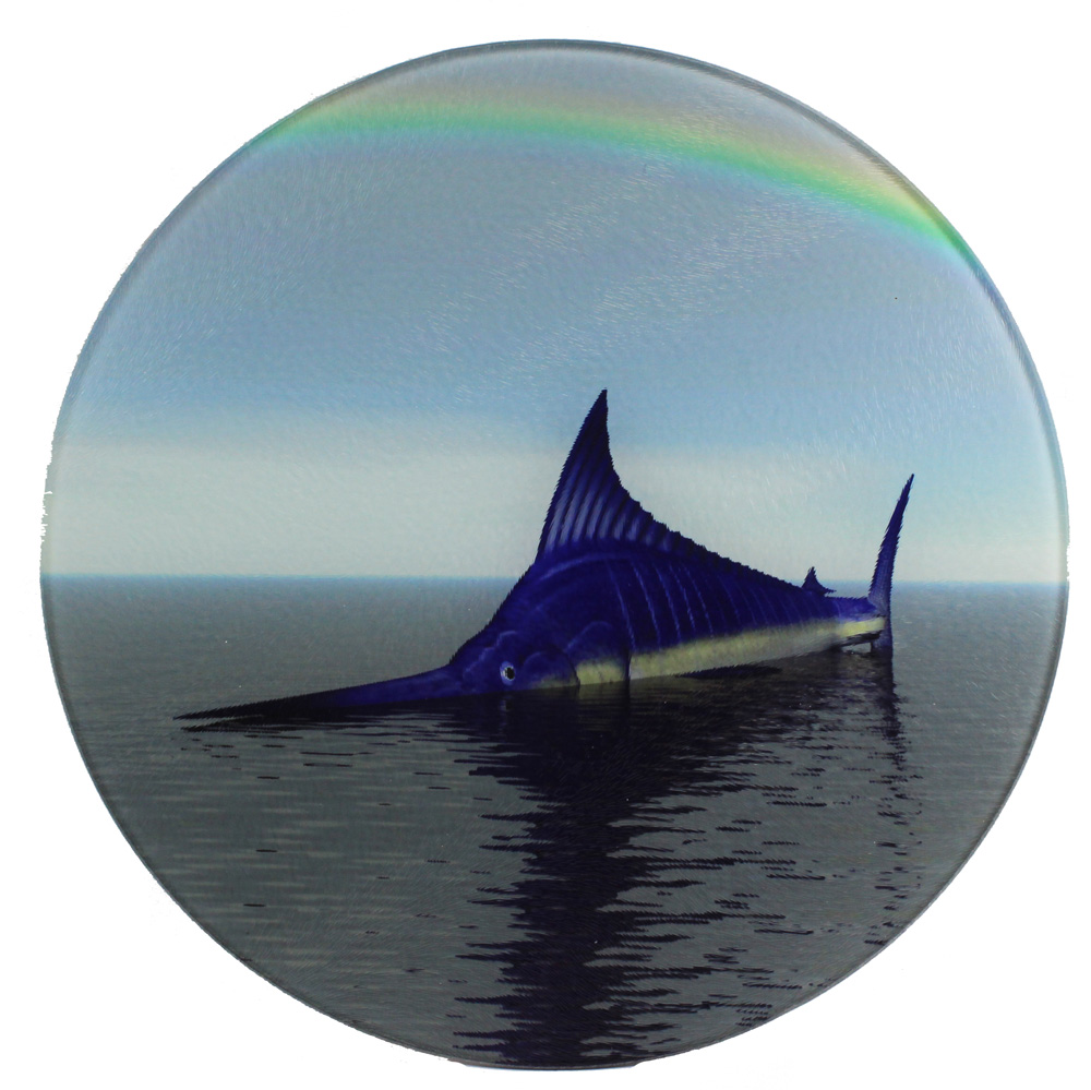 This 12″ Marlin Tempered Round Glass Cutting Board is made of tempered glass and measures approx. 12″L x 12″H. These artistically inspired tempered glass sheet boards are perfect for: cutting boards, trivets, elegant dining presentations, counter top art, serving platters and pastry boards. Knife friendly textured surface, vibrant and fade resistant color, heat resistant, durable, non-slip rubber feet, hygienic. Wash and dry by hand.