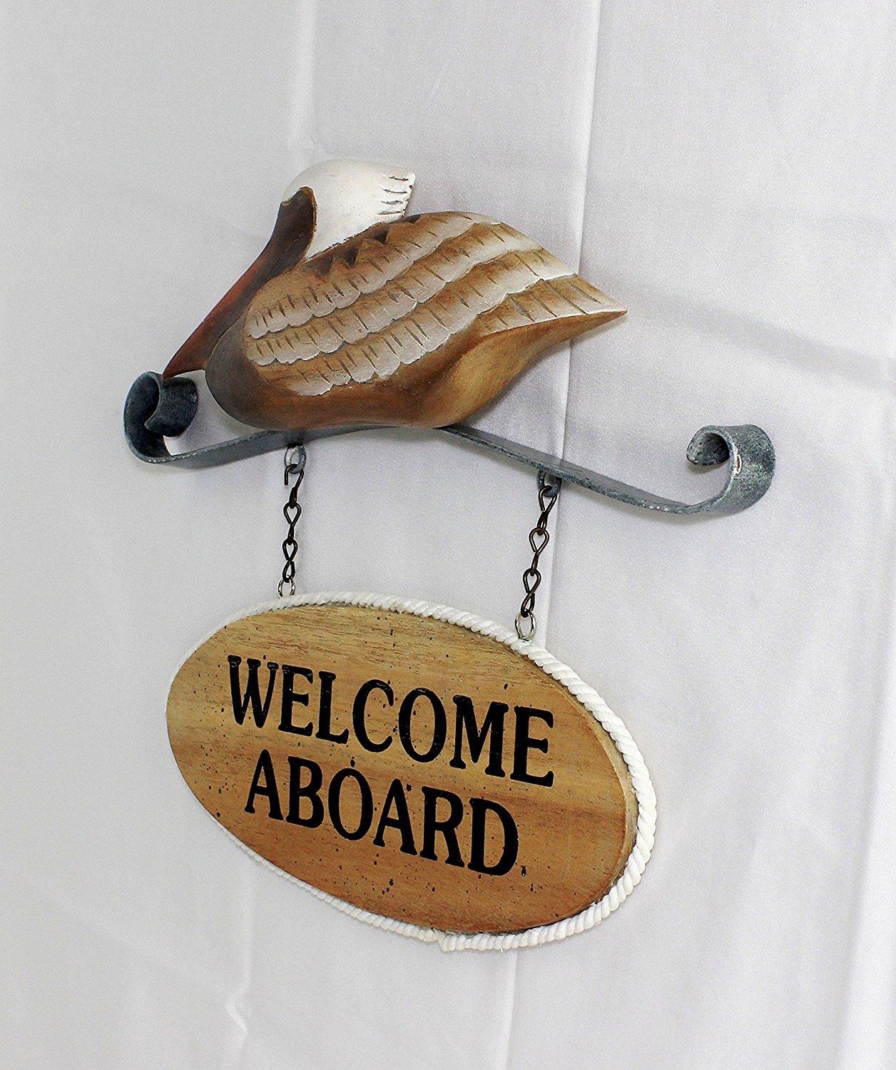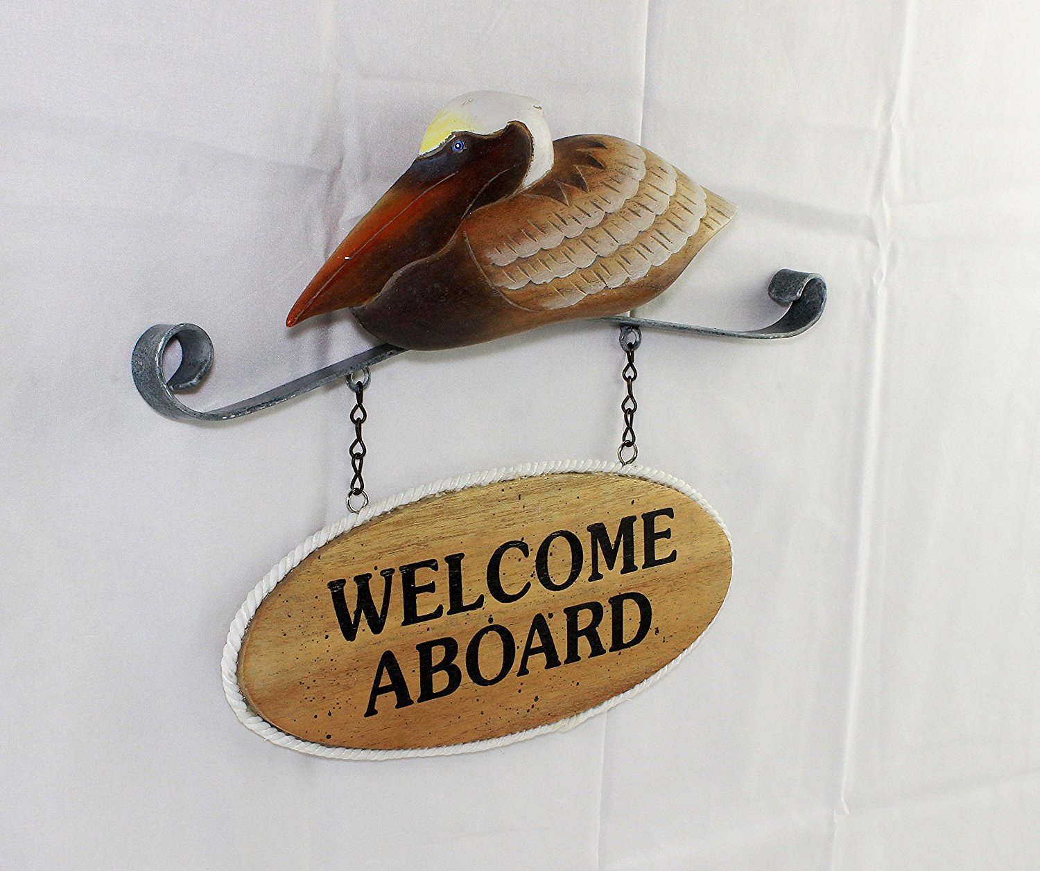 This 12″H Metal & Wood Pelican Welcome Aboard Wall Sign is made of metal and wood and measures approx. 12″H x 9″L x 1.5″W. Features a gorgeous metal pelican above a “welcome aboard” sign that hangs on a chain and has a rope frame. Mounts easily to the wall using the provided bracket.