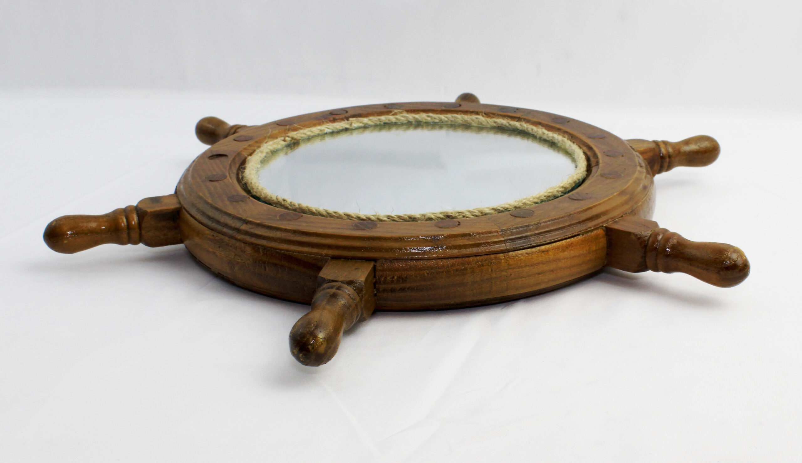This 13″Dia Wooden Ship Wheel Wall Mirror would make a great addition to any room in your home. Made of solid wood with a glass mirror, this piece measures approx. 13″Dia. Features 6 spokes and a nautical rope accent around the mirror. Hangs easily using the provided bracket on the back.