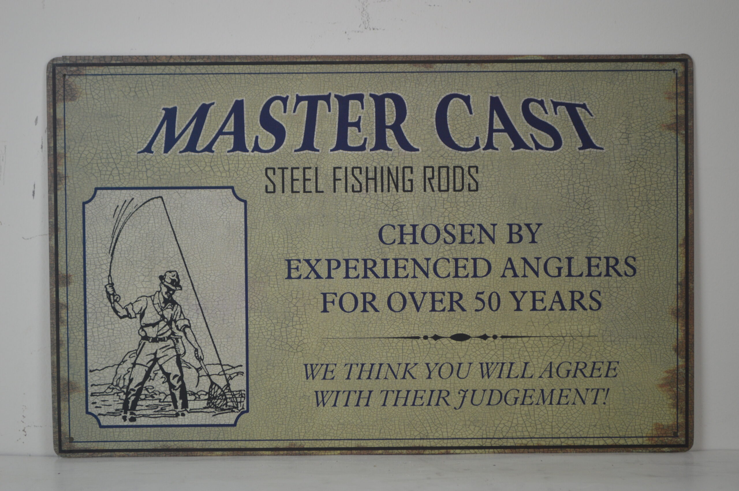 16″L Master Cast Fishing Rod Advertisement Tin Wall Sign