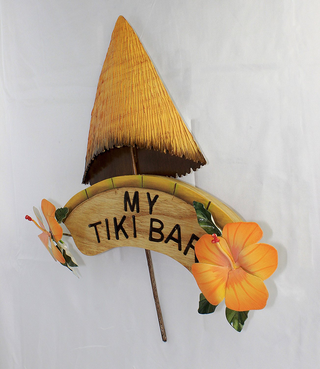 This 17″H Metal My Tiki Bar Wall Sign is made of metal and measures approx. 17″H x 16″L x 2.5″W. Features a gorgeous “My Tiki Bar” sign with a metal thatch look umbrella above it, along with two beautiful flowers. Mounts easily to the wall using the provided bracket on the back.