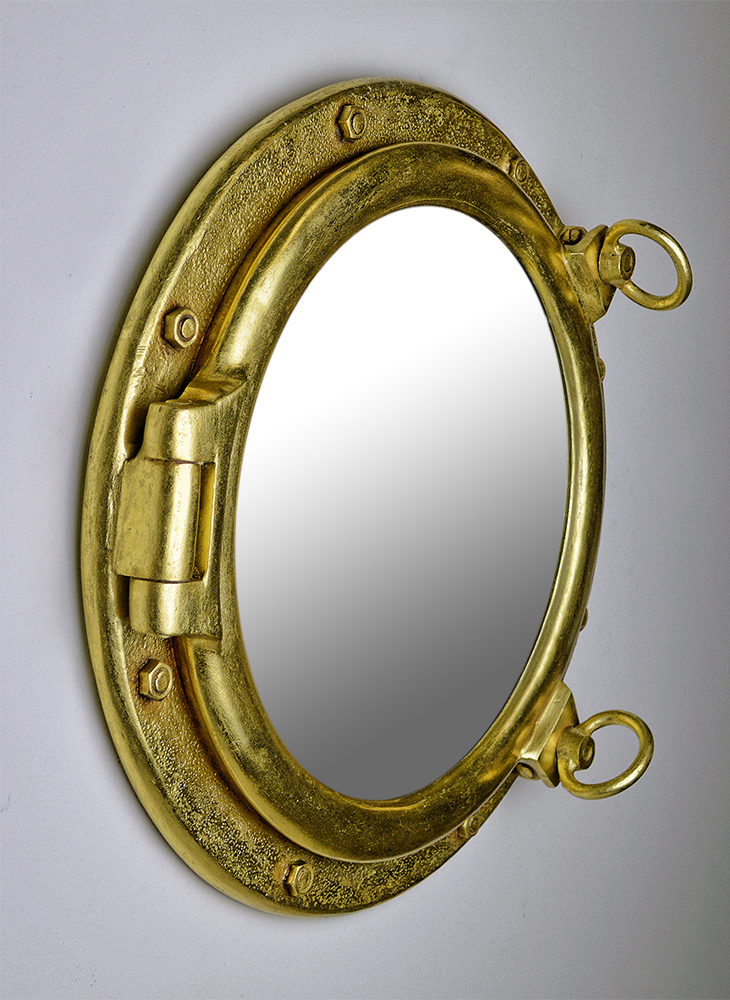 This 20″ Gold Leaf Finish Porthole Mirror would make a great addition to any nautical themed room in your home. This porthole mirror is made of fiberglass and resin. The mirror measures 14″ in diameter and 4.25″ deep to dogear. This porthole mirror features real looking faux nuts and large metal dogears. Place this item in your lake house, bar, bathroom, or in any other nautical themed room you can imagine.