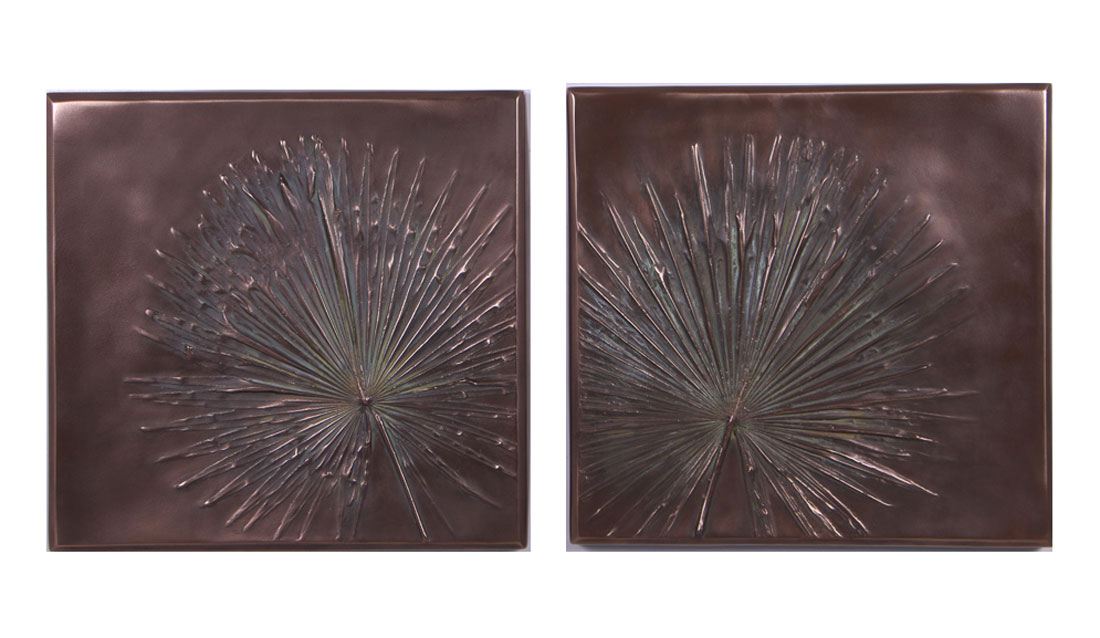 This gorgeous pair of Anahaw Plaques with an intricately textured surface would bring a touch of the tropics to any space. Made of lightweight fiberglass resin, this item has a hand-rubbed verde bronze finish that is suitable for both indoors and outdoors. The finish will patina over time, but a clear coat polyurethane rated for use with fiberglass can be applied as needed to protect from the elements if placed outdoors. These gorgeous plaques hang easily on the wall using the heavy wire in the back. The luxe, verde bronze finish compliments any room’s decor and would make a stunning tropical addition to living rooms, bedrooms, offices, and more!