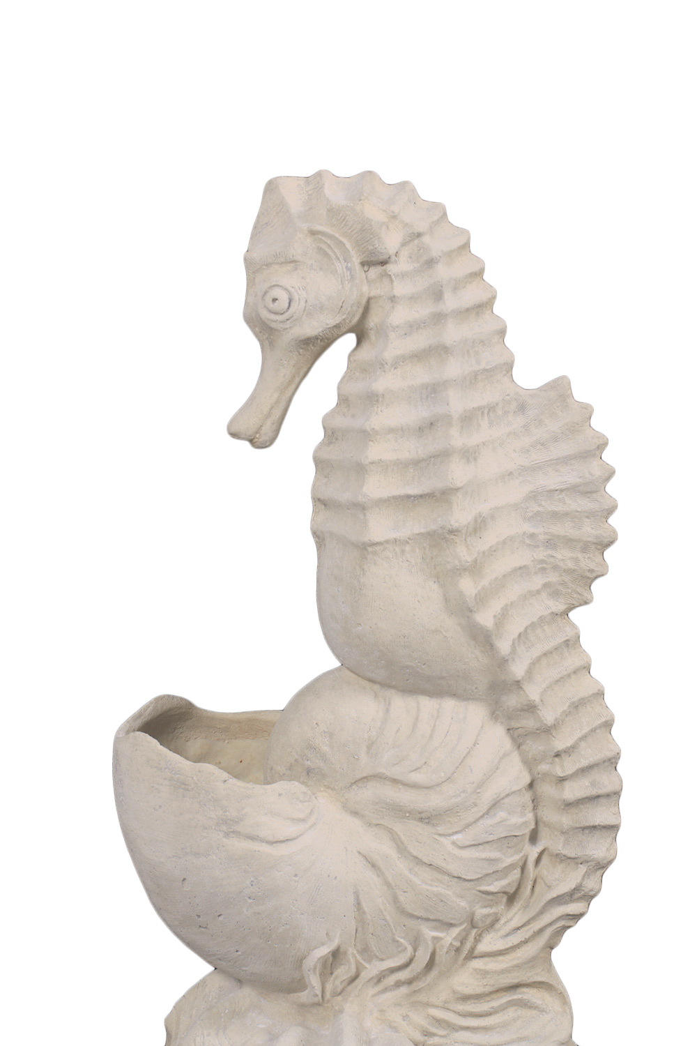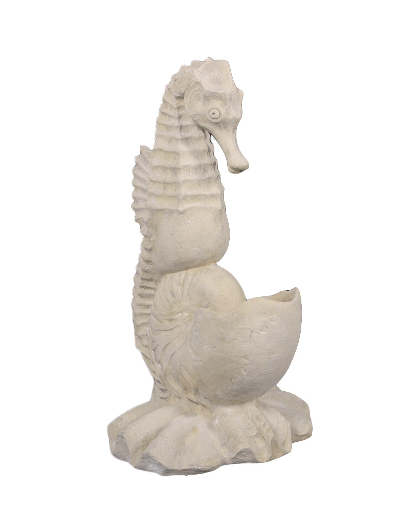 This 29″H Seahorse Table/Floor Water Fountain – Roman Stone Finish would make an absolutely stunning addition to any room in your home. Made of sturdy fiberglass resin, this piece measures approx. 29″H x 17.75″L x 16″W. Features a gorgeous roman stone finish that is suitable for both indoors and outdoors, however, if placed outdoors, this piece will patina like a real stone piece. The seahorses mouth spits out water into the shell below, creating a beautiful scene. The water pump is INCLUDED with this piece. Place this item in your bar, garden, or any nautical themed room you can imagine.
