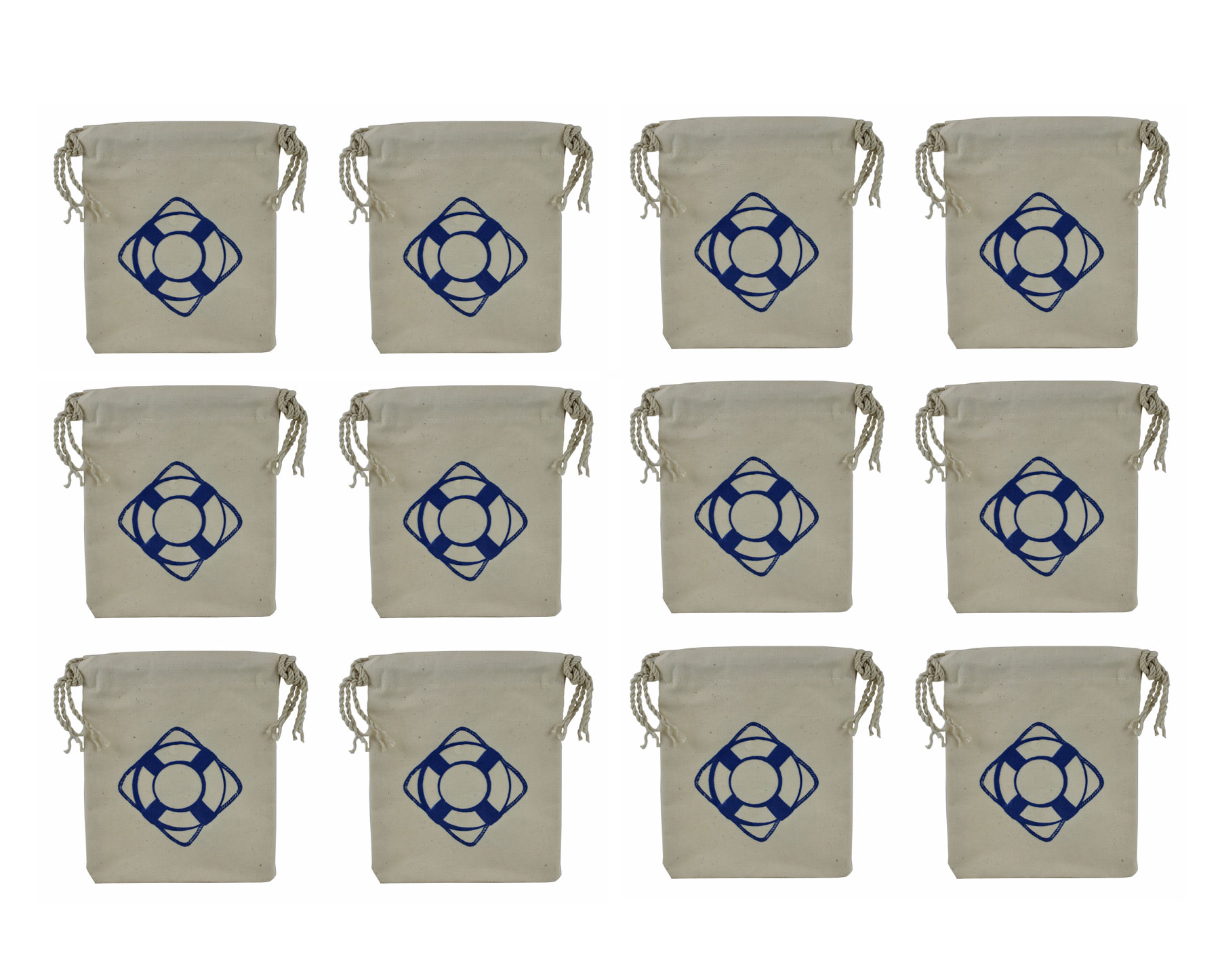 This set of drawstring cotton pouches is ideal for party favors, small gifts, craft and jewelry fairs, sachets, and more! Sturdy cotton fabric with a cotton drawstring featuring a blue silk screened life ring motif on both sides. Each pouch measures approximately 5.5″x6.75″. Pouches come individually wrapped in a polybag. Listing is for gift bags only. Objects shown in photos are intended for usage inspiration and are not included.