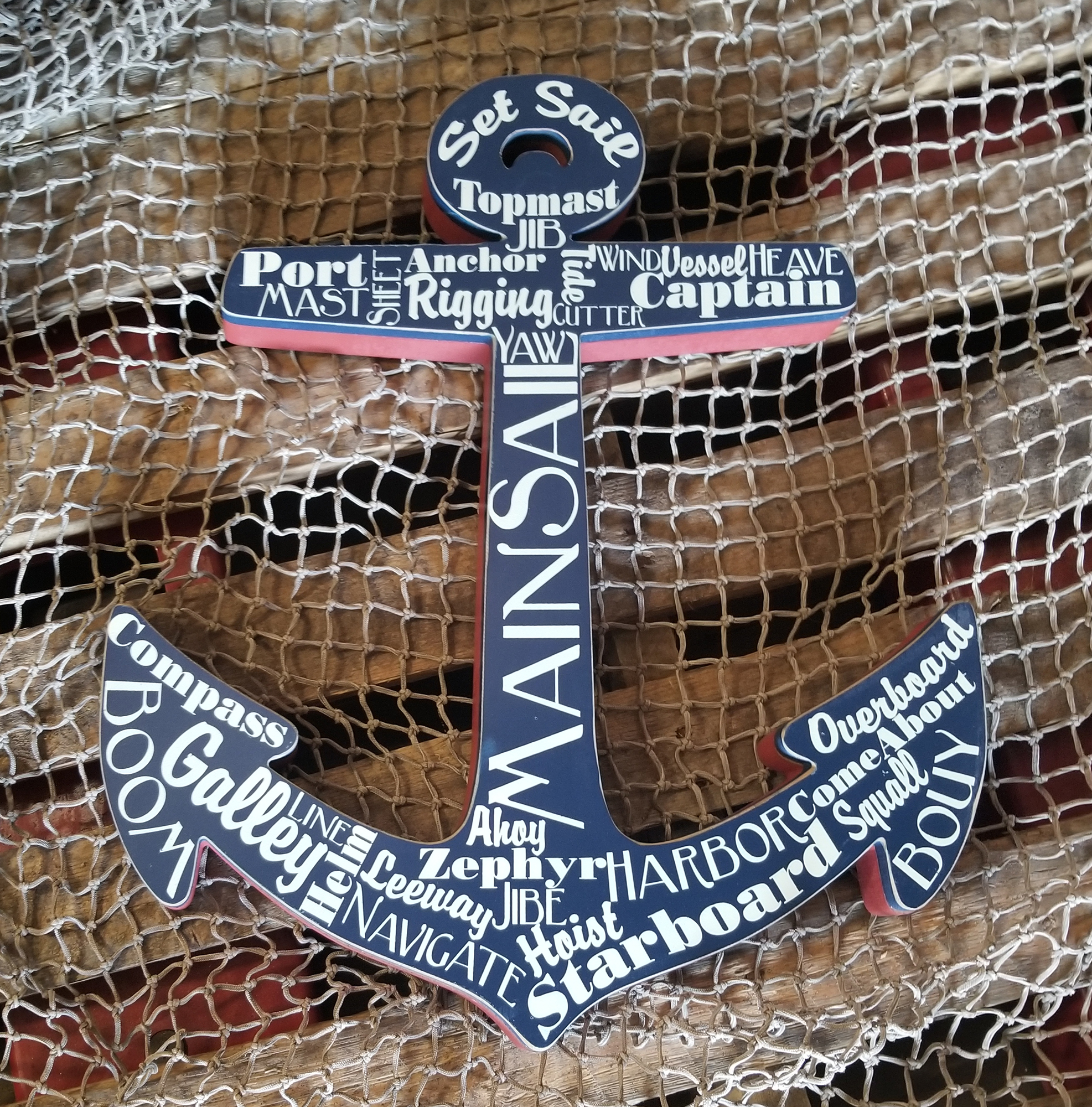 Add a nautical flair to bare walls with this Anchor of Nautical Words Plaque. Constructed from wood, this stout plaque features many maritime themed words. Hang on the wall with top hole. Make the perfect gift for any ocean or ship lover.