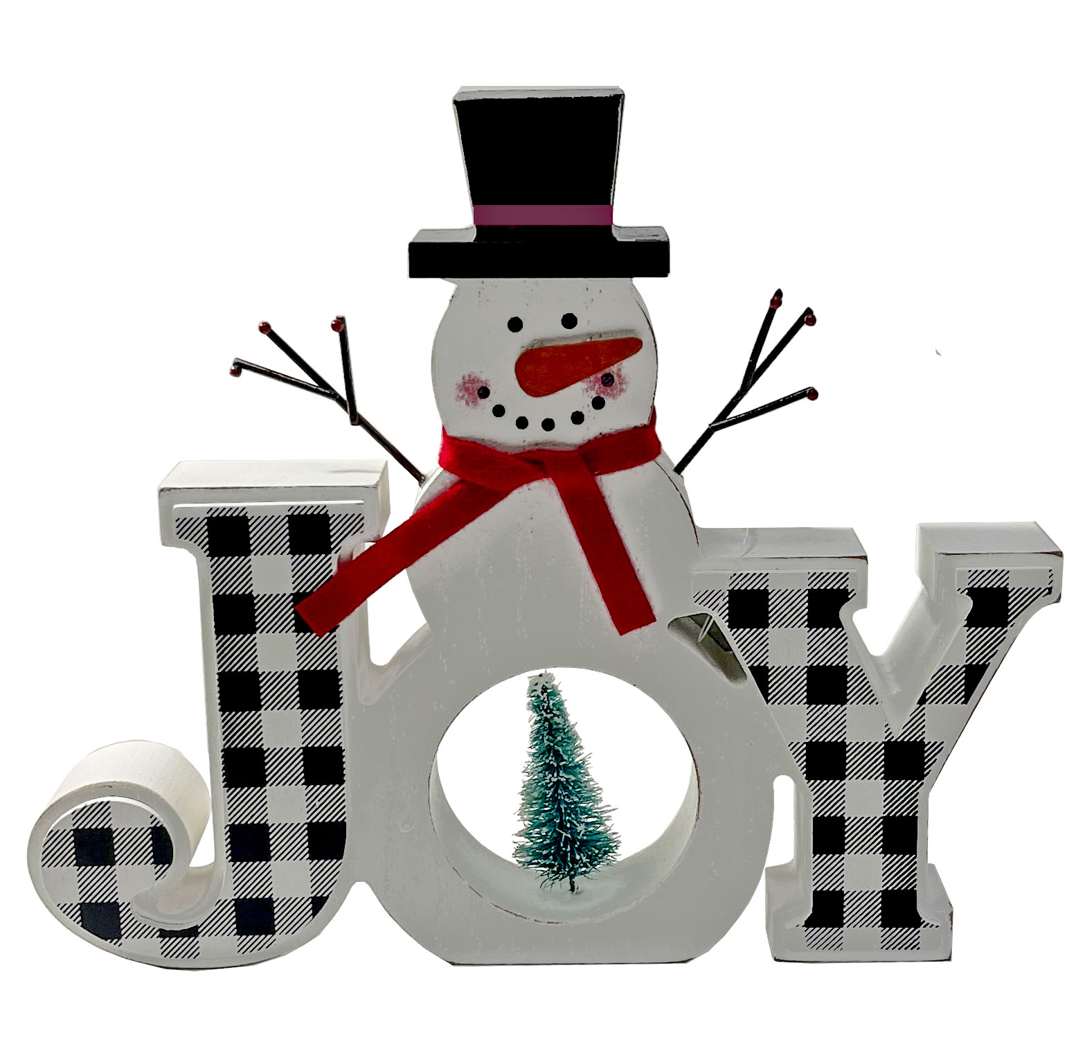 Add a some jolly Christmas décor to your home with this beautiful Joy Table Top Block. Constructed out of wood, this table block features the word JOY made out of the letters J and Y in black and white plaid and the O made out of a snowman. This whimsical snowman is adorned with a red felt scarf and a pine tree accent . A wonderful addition to your Christmas décor that can be easily placed on a shelf, cabinet, counter, window sill, or chimney. Measures approx. 10″L x 1.25″W x 8.5″H.