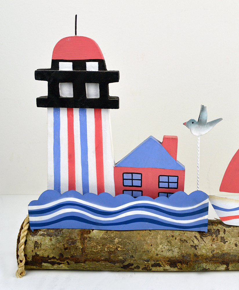 This adorable Lighthouse with Sailboats and Seagulls would make a charming nautical addition to any space! Made of wood and tin, this piece is hand painted in a bright color scheme and distress finished. Each piece is fixed to a wooden log base, creating a rustic appeal. Please be advised that being crafted from wood and hand painted, some natural cracking and color variations may occur. Great for your bathroom, office, child’s room, patio, and more! Measures approx. 18″L x 11.5″H x 3″W.