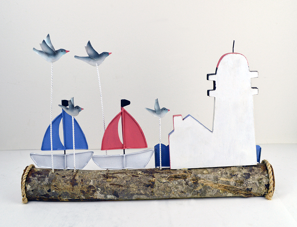 Lighthouse with Tin Sailboats and Seagulls on Wooden Log Base