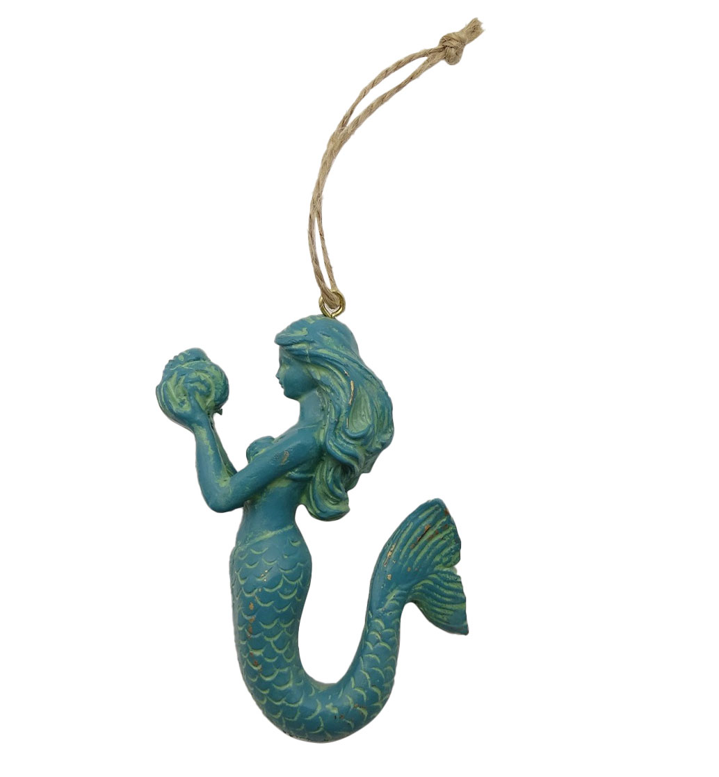 Add some magic to your home with this gorgeous ornament. Made out of durable poly-resin, this turquoise ornament portrays a beautiful Mermaid holding a nautilus shell. Ornament features great detailing with distressed green and gold accents. Measures approx. 2.5″L x 2″w x 3.25″H.