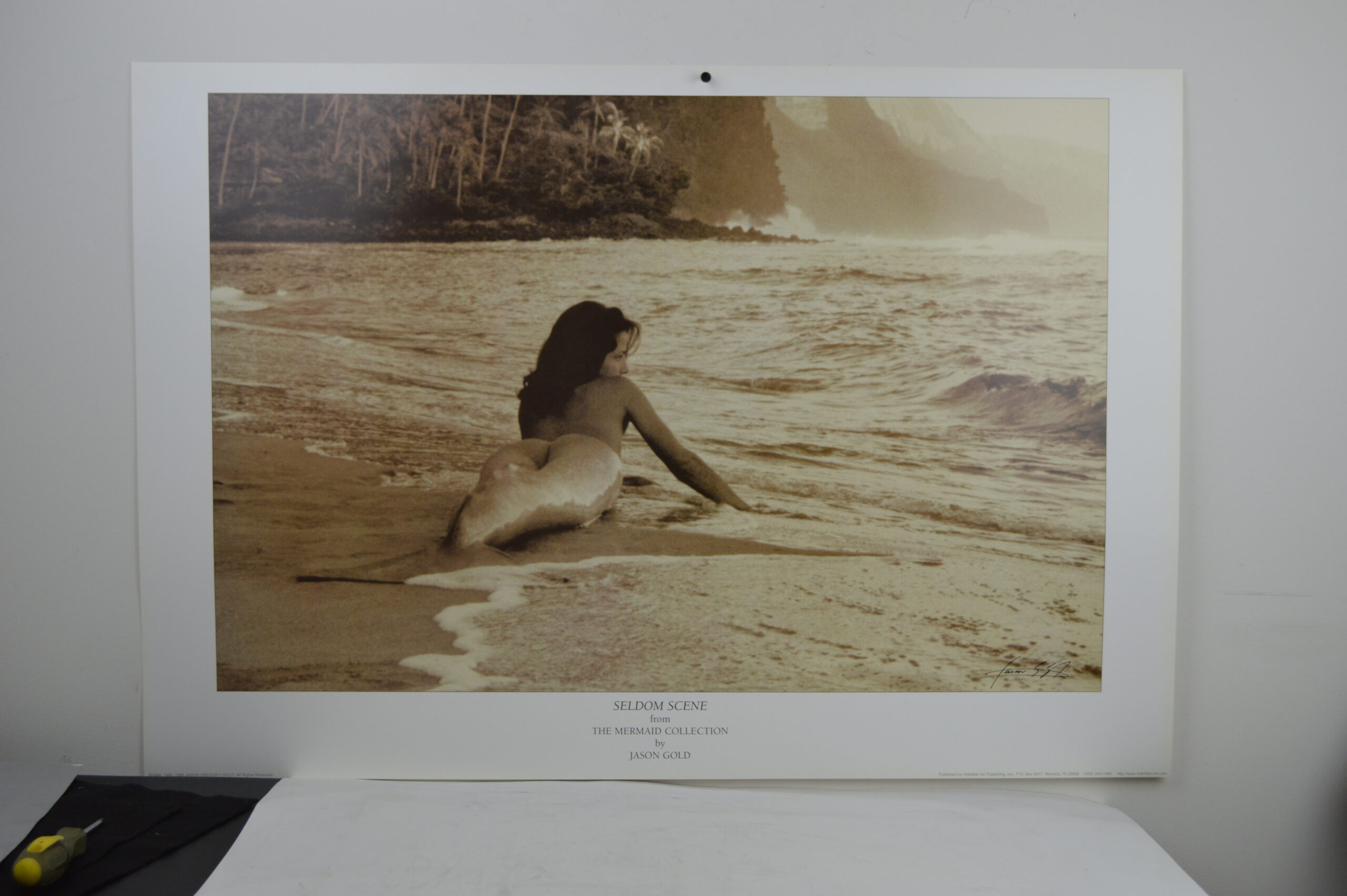 This Seldom Scene Mermaid Poster 2′ x 3′ would make a gorgeous addition to any room in your home. This print features a real life mermaid lounging on the sand and enjoying the waves as they roll in. This piece measures approximately 24″H x 36″L. Part of Jason Gold’s “Mermaid Collection”, which was originally intended for the photographer’s private collection, but has since taken on a life and legend of its own. Their mystery and sensual allure continue to fascinate people; turning heads and kindling imaginations wherever they are displayed. Hang this one of a kind piece in your nautical themed bar, bedroom, or bathroom.