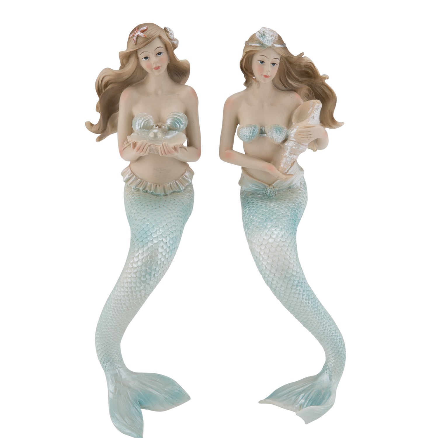 Set of 2 shelf sitting Mermaid. A must buy item. Two beautiful mermaids that give a fantasy feel. Give it as a gift or add to your collection. Manufactured in China.