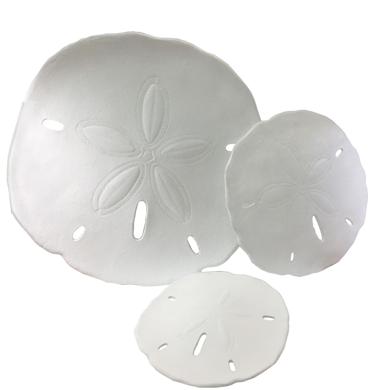 Add a gorgeous nautical flair to any room in your home with this set of 3 sand dollars. Made out of resin with a painted White finish, this set features great detailing. Each sand dollar has a stem like back, which makes the sand dollars have a floating dimensional effect. They will not hang flush with wall. You will receive a large 19″, a medium 13.5″, and a small 9.5″ Diameter sand dollar in each set. Makes a great decorative accent or house warming gift.