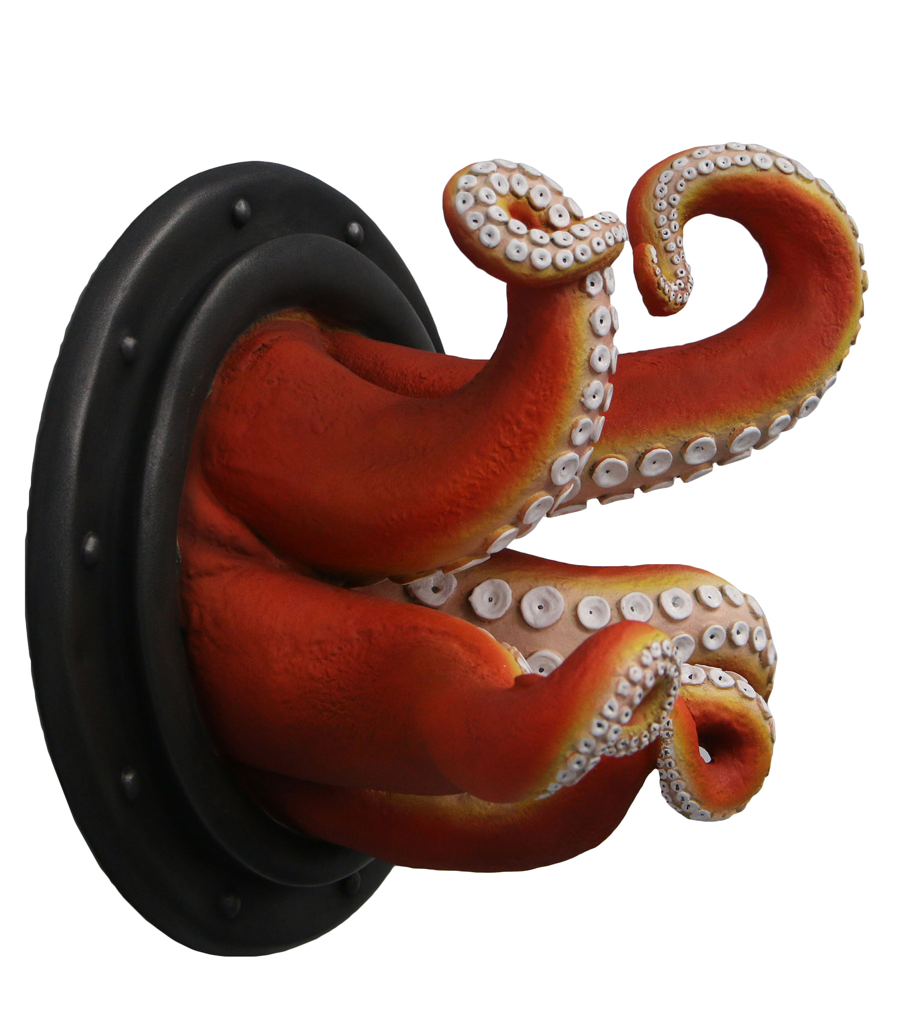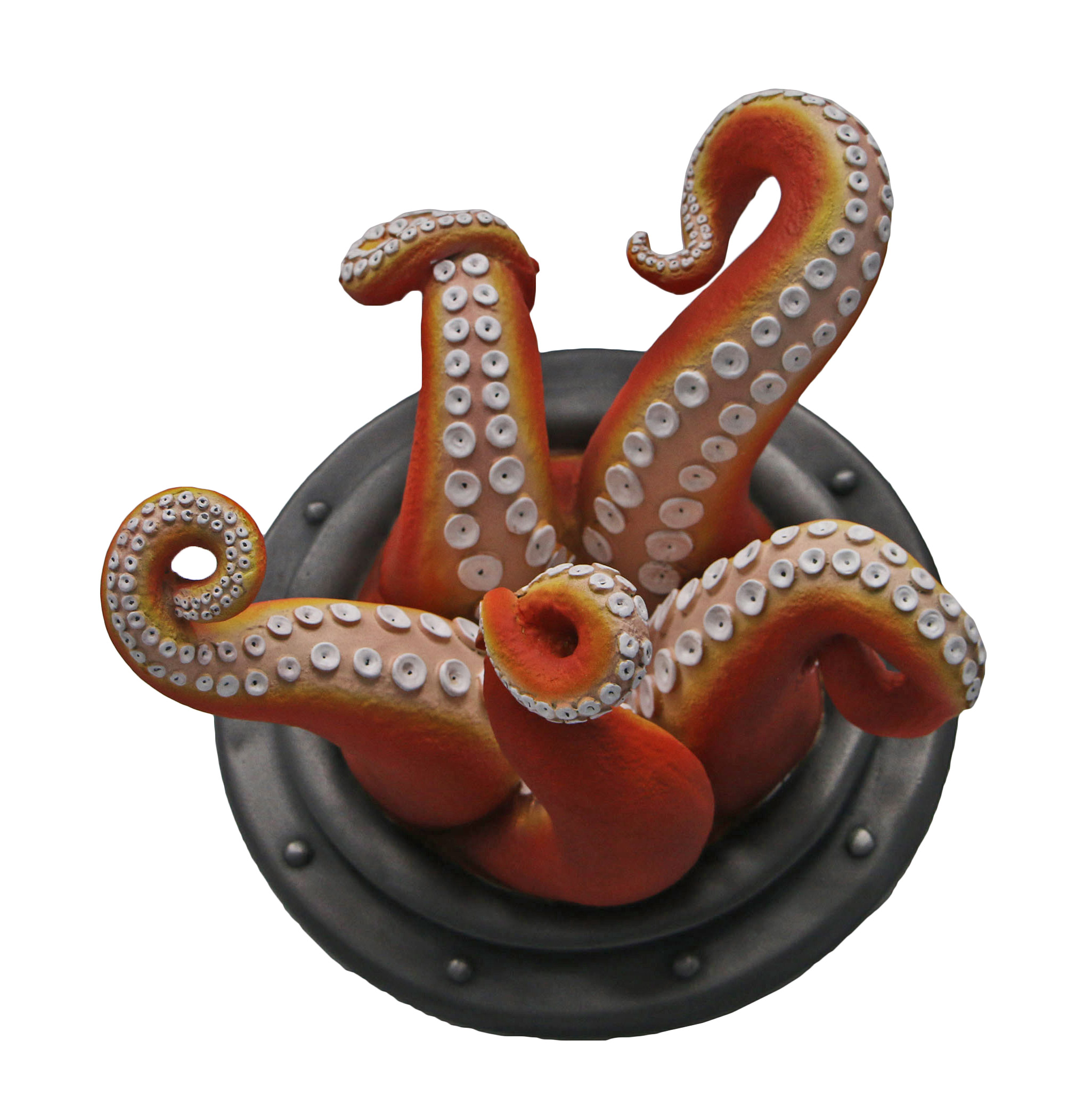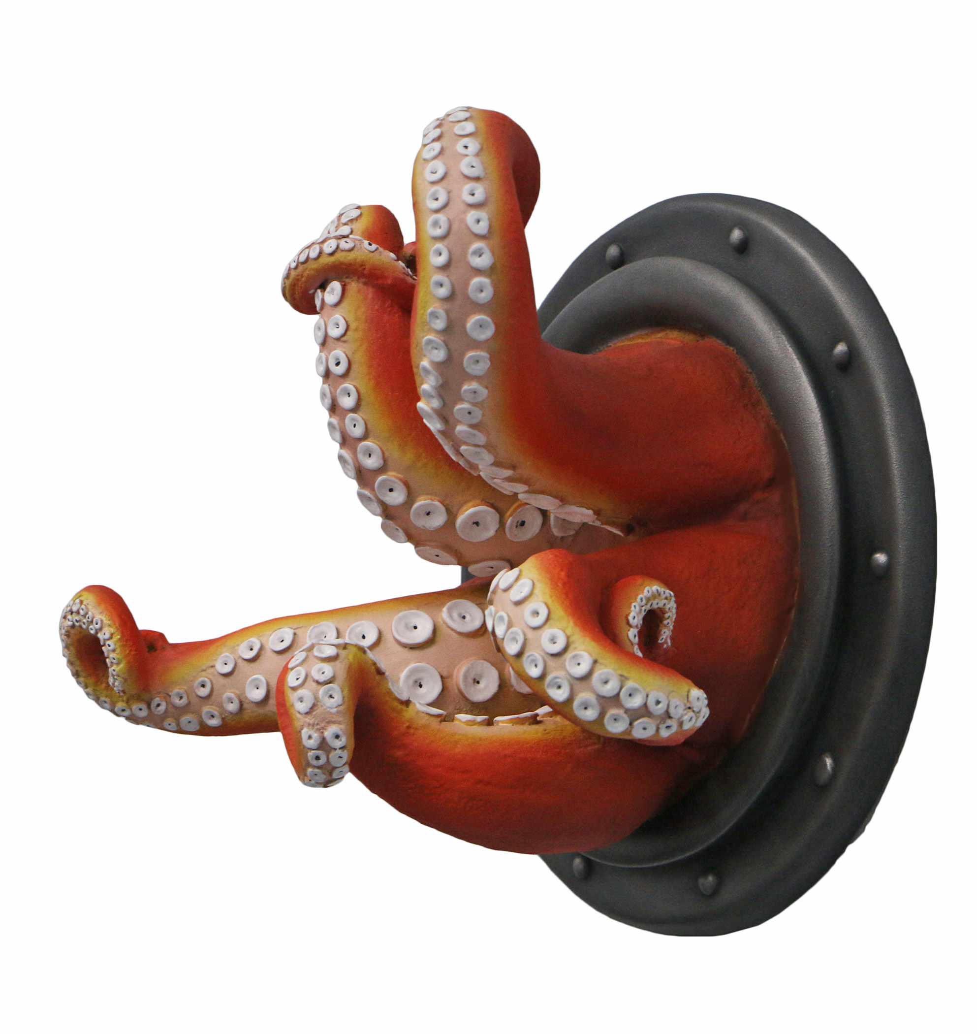 Bring the sea home with this awesome 3 dimensional Octopus wall art. Constructed out of quality fiberglass resin, this wall sculpture brings the illusion of an octopus or kacken tearing through a porthole window. The octopus tentacles are bright red orange and feature great attention to detail. The porthole ring features a real hand rubbed iron finish. This item measures approx. 16″H x 16.25″L x 11.75″W. This conversation starter will create a unique under the sea aesthetic in any space!!