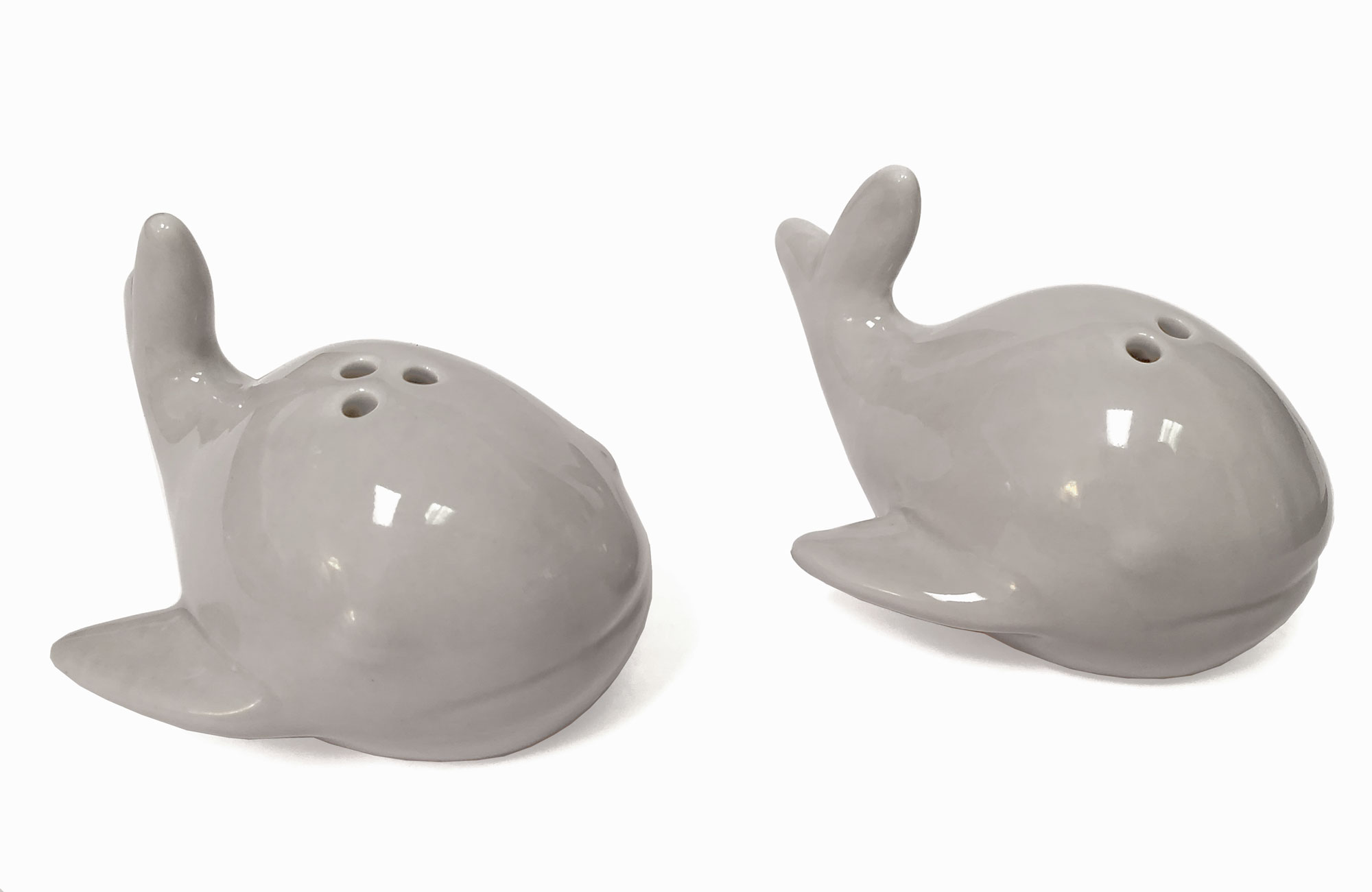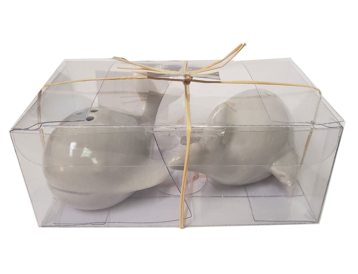 Add some fun to your kitchen table with these Whale Shaped Salt and Pepper shakers. Made out of ceramic, these shakers feature a gray glazed finish. Each shaker comes with rubber stopper on the bottom so you can easily fill them with your desired seasonings. Each set comes in its own clear presentation box with a raffia tie. Perfect for gifting!